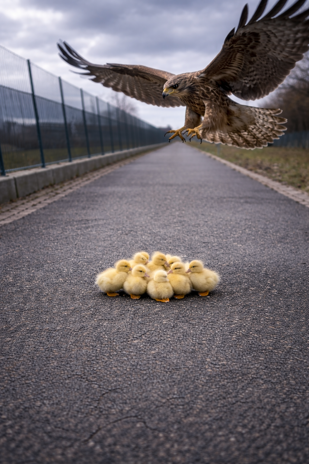 From above, a large hawk-like bird descended, wings wide and powerful against the gray sky. Its motion was silent but deadly. The ducklings looked impossibly small beneath it.
